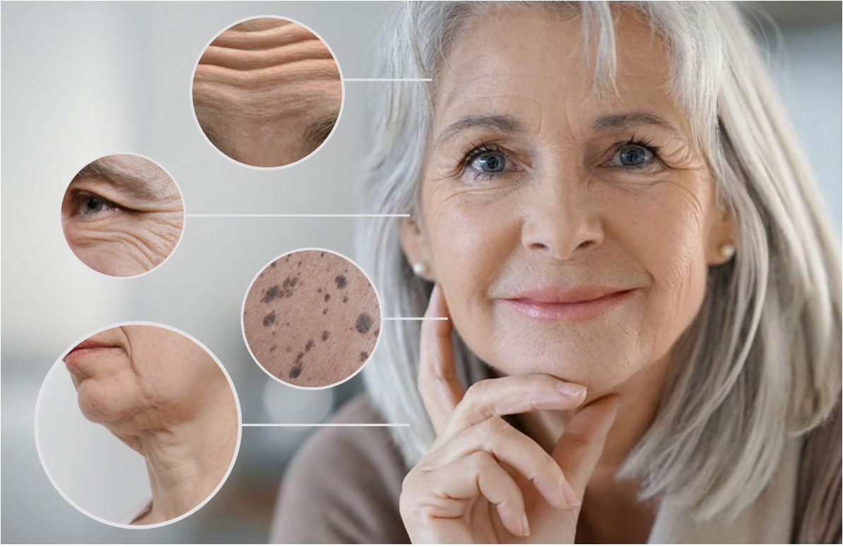 קמטוטים, קמטים, כתמים, שומות, פיגמנטציה, נגעים בולטים וכמובן נזקי שמש. שינויים מתחת לעור: נימי דם בולטים בצבע ובמגע, ורידים קופצים החוצה.