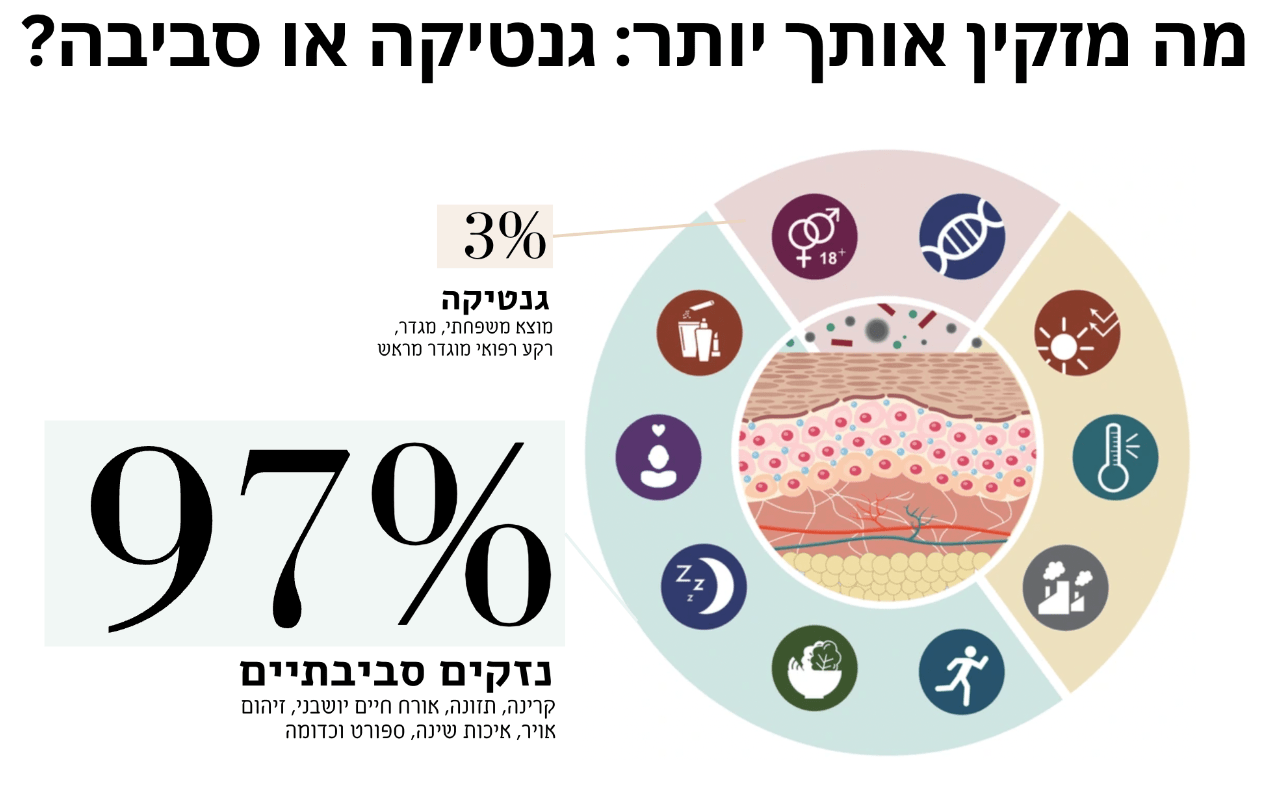 מחקר אחרון בתחום הדרמטולוגיה מצא שדווקא גורמים חיצוניים הם הגורם העיקרי בהדרדרות העור (97%) וכי למרות ההנחה הרווחת, גנטיקה משפיעה רק 3% על איך שתראו בגיל מבוגר. ובכן, אלו כבר חדשות משמחות במיוחד!
